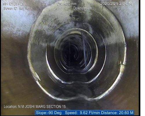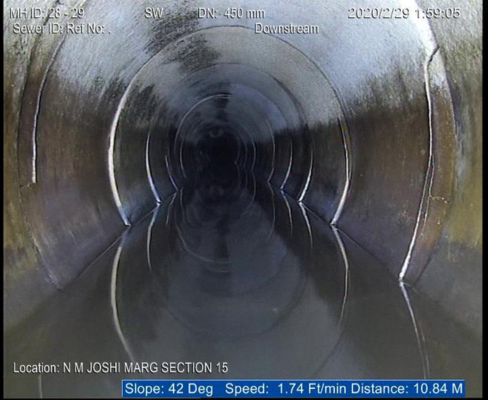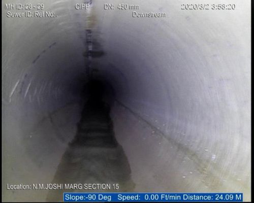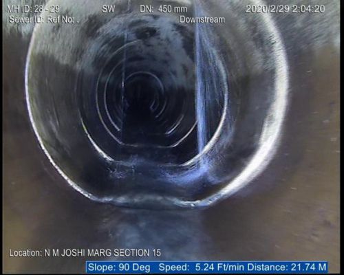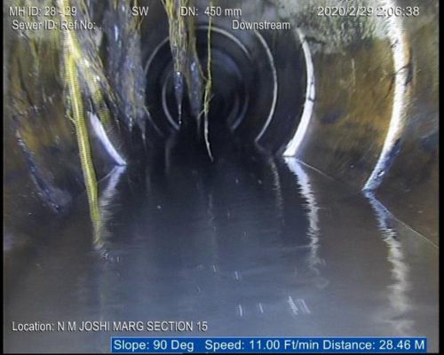 The sewerage system of Mumbai, the financial capital of India is a century old and the city experiences massive rains every year. Last year however the season’s entire rainfall was received in just 21 days, water logging in all low lying areas including N.M Joshi Marg where the Brihan Mumbai Municipal Corporation has been promising relief to residents, users and commuters for long but to no effect. N. M Joshi Marg was under 8 to 10 inches of flood water and life almost comes to a standstill every year. Onsite India was awarded the work of rehabilitation of this sewer. Our team reached the site for a CCTV survey and the images from the survey have been furnished below. The line had multiple problems like ground water infiltration, deformity, intruding roots to mention some. A 50 meters stretch in this line was totally cracked and could have collapsed any moment. Our team took immense care to survey down this area but finally we were successful in producing the entire footage to the BMC who decided to rehabilitate this as soon as possible to save themselves and the civic life from immense amount of catastrophe.